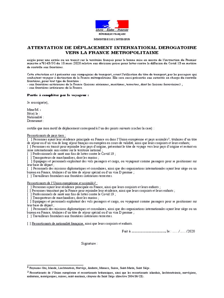 Attestation De Deplacement International Derogatoire Vers La France Metropolitaine France Visa Document