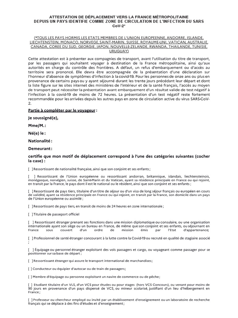 Attestation de déplacement dérogatoire et Déclaration sur lhonneur À leur arrivée en France toutes les personnes soumises à motif impérieux de voyage quels que soient leur âge et leur pays de provenance doivent détenir une attestation dérogatoire de déplacement vers la France métropolitaine. As required by United States federal law all airlines or other aircraft operators must confirm either a negative COVID-19 test. To get this cover youll need an Attestation Certificate.